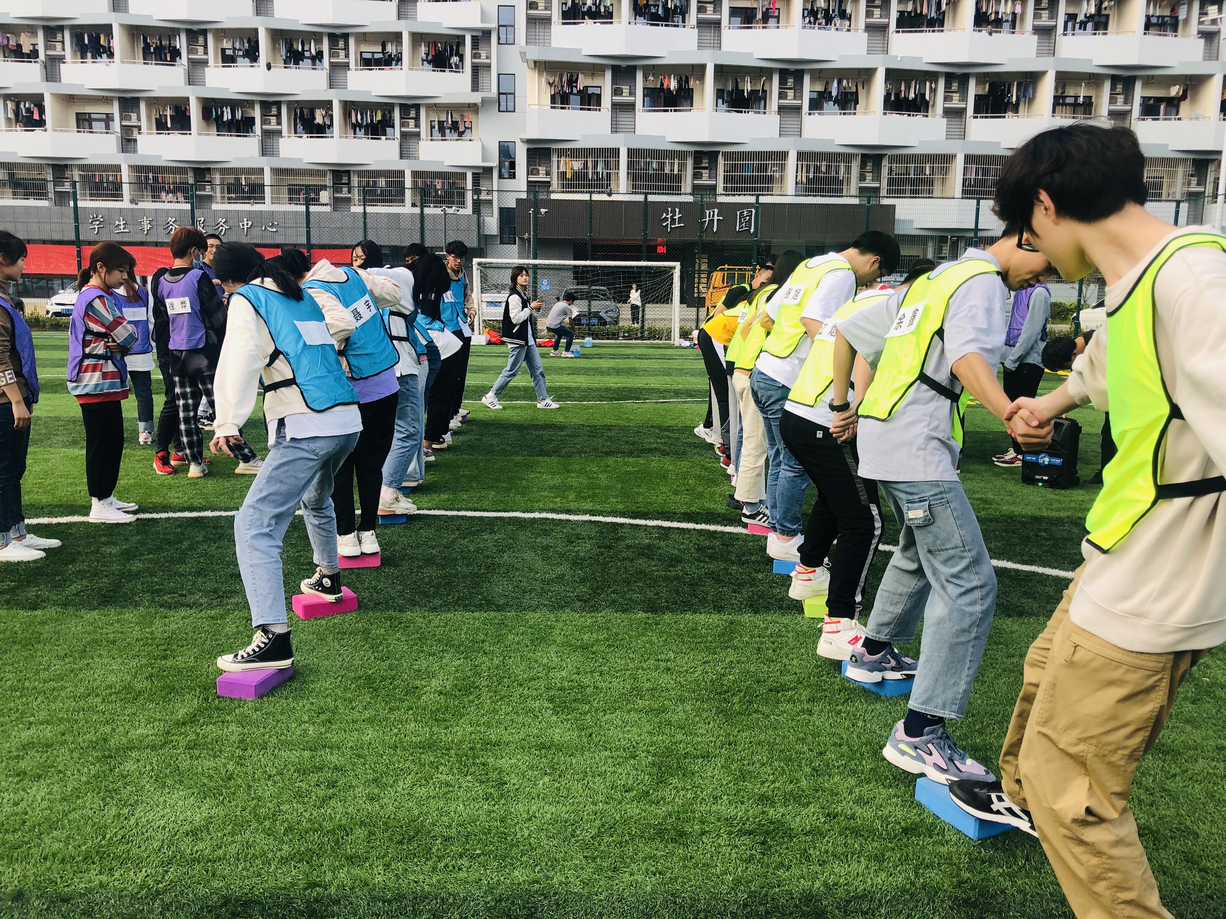 秋风送爽,丹桂飘香,活动开始前,学工办刘婷婷老师倾情献唱了一首《爱在四季》,清澈而又有穿透力的声音点燃了同学们的热情。在工作人员的带领下,同学们完成准备活动之后,展开了“前方有难后方支援”、“千人过河”、“指压板借力挑战赛”、“撕名牌”四个团辅项目。