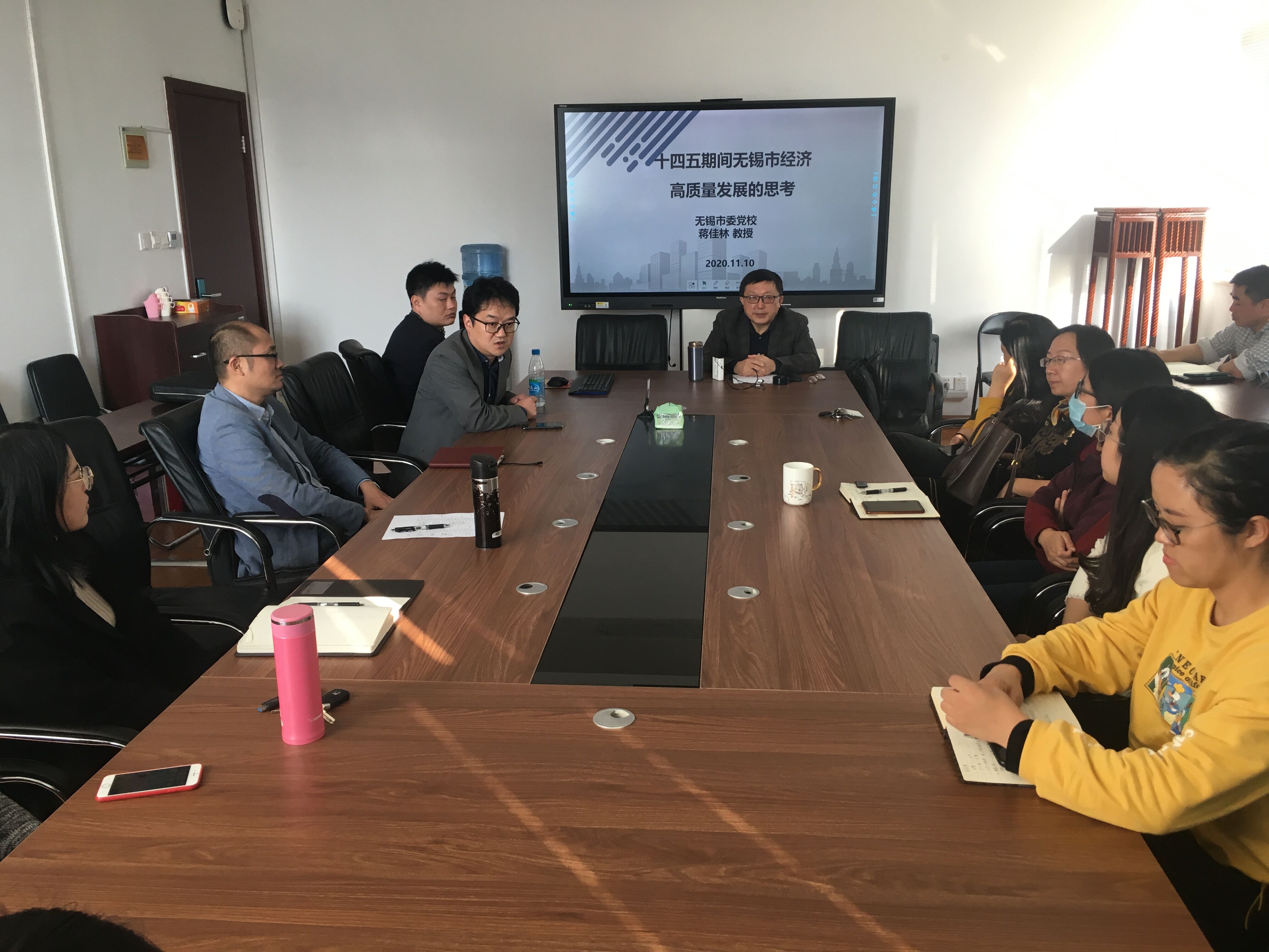 11月10日下午,无锡市委党校蒋佳林教授应邀在明德楼A415会议室做了题为“十四五无锡市经济高质量发展的思考”的学术报告。本次活动由社科处组织,管理学院承办,学校相关专业教师到场聆听。