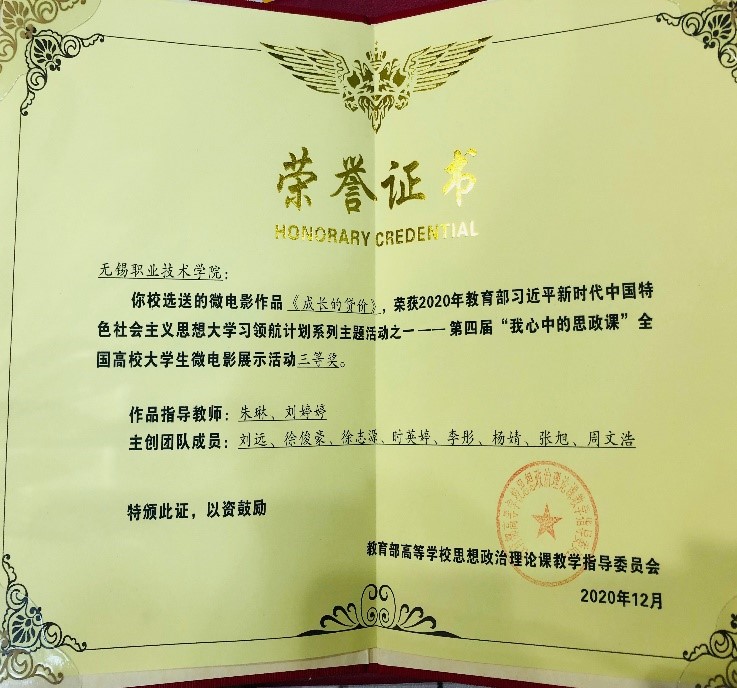 2021年1月20日,第四届“我心中的思政课”全国高校大学生微电影大赛线上总结交流会在武汉大学举行。由我院朱琳老师、刘婷婷老师指导,市场营销专业19级同学刘远等共同完成的微电影作品《成长的贷价》荣获三等奖。