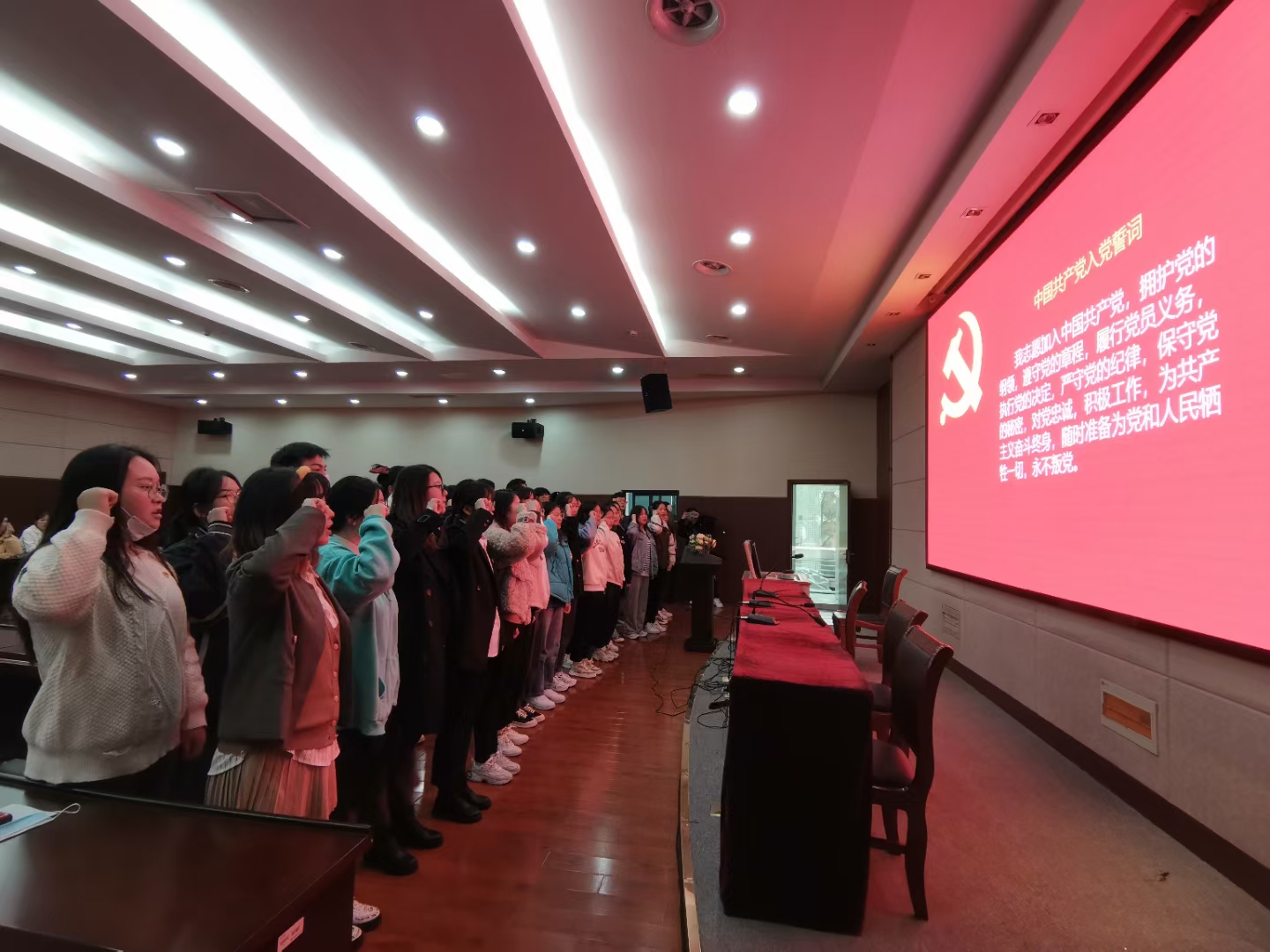 在会议上,朱琳老师首先介绍了这31位入党积极分子的基本情况,随后每位发展对象宣读了入党志愿,并讲述了自己申请入党前后思想上、行为上的认识与进步,让在场的党员更深入了解情况。接着,入党介绍人分别宣读了介绍意见,现场参会的同学们积极参与讨论。之后,由朱琳老师组织正式党员进行投票表决,最终,张紫秋等31名入党积极分子全票通过,顺利成为预备党员。朱琳老师在宣读大会决议之后,为新发展入党的同学们佩戴党员徽章,全体党员面对党旗庄严宣誓。