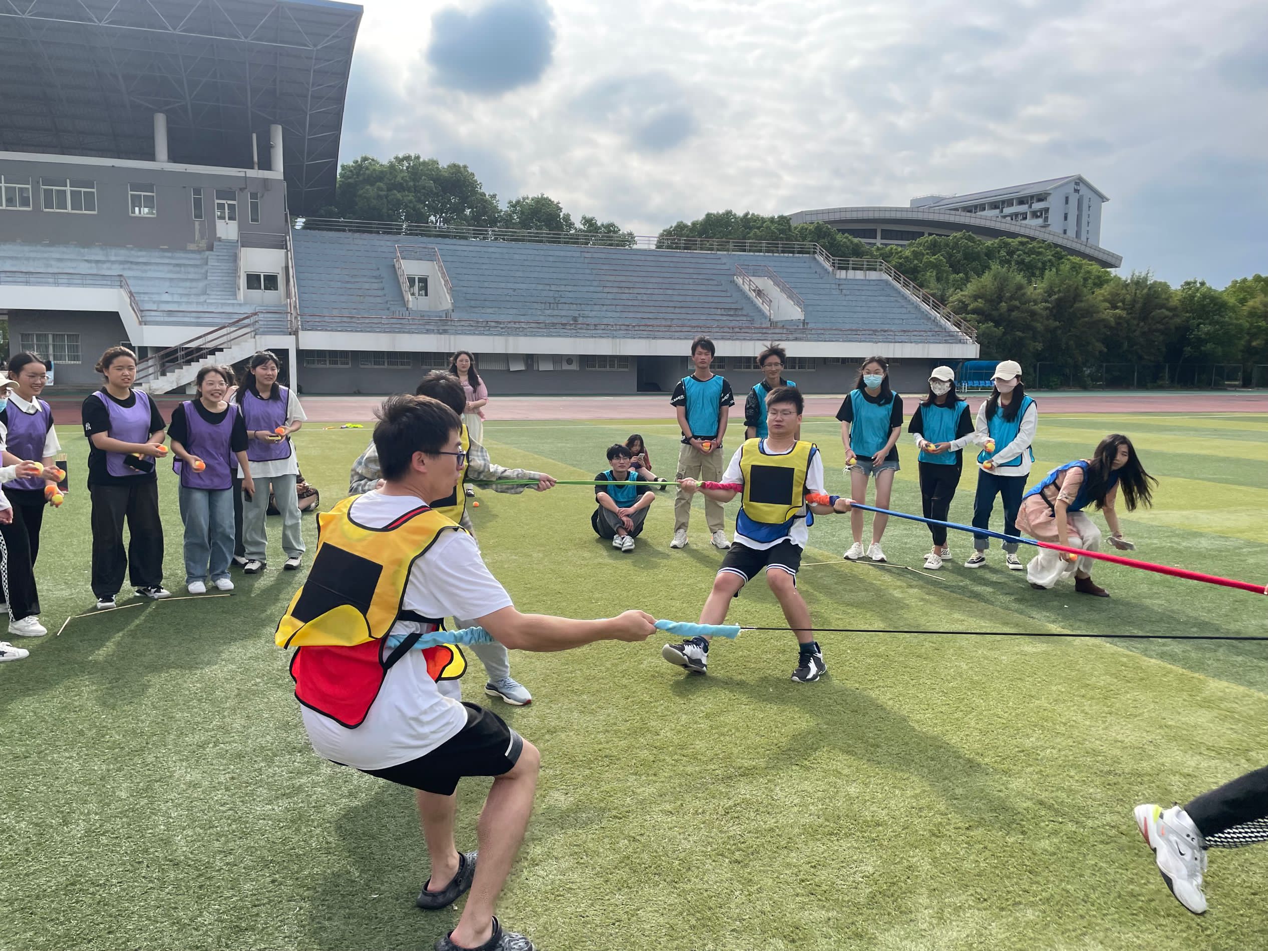 本次活动,有珠行万里,投壶,袋鼠跳、东西南北跑等游戏,还有粽子和五彩绳的奖品,十分贴近端午节的节日气氛。在场的学生分为红、蓝、黄、紫四支队伍,团队作战,一起欢声笑语庆端午。“袋鼠跳”的环节中,每队队员套着袋鼠袋进行折返跑,比拼弹跳能力和平衡能力;“投壶”环节中,每组成员都要拿着“箭”进行投射,最后看谁投中的多。