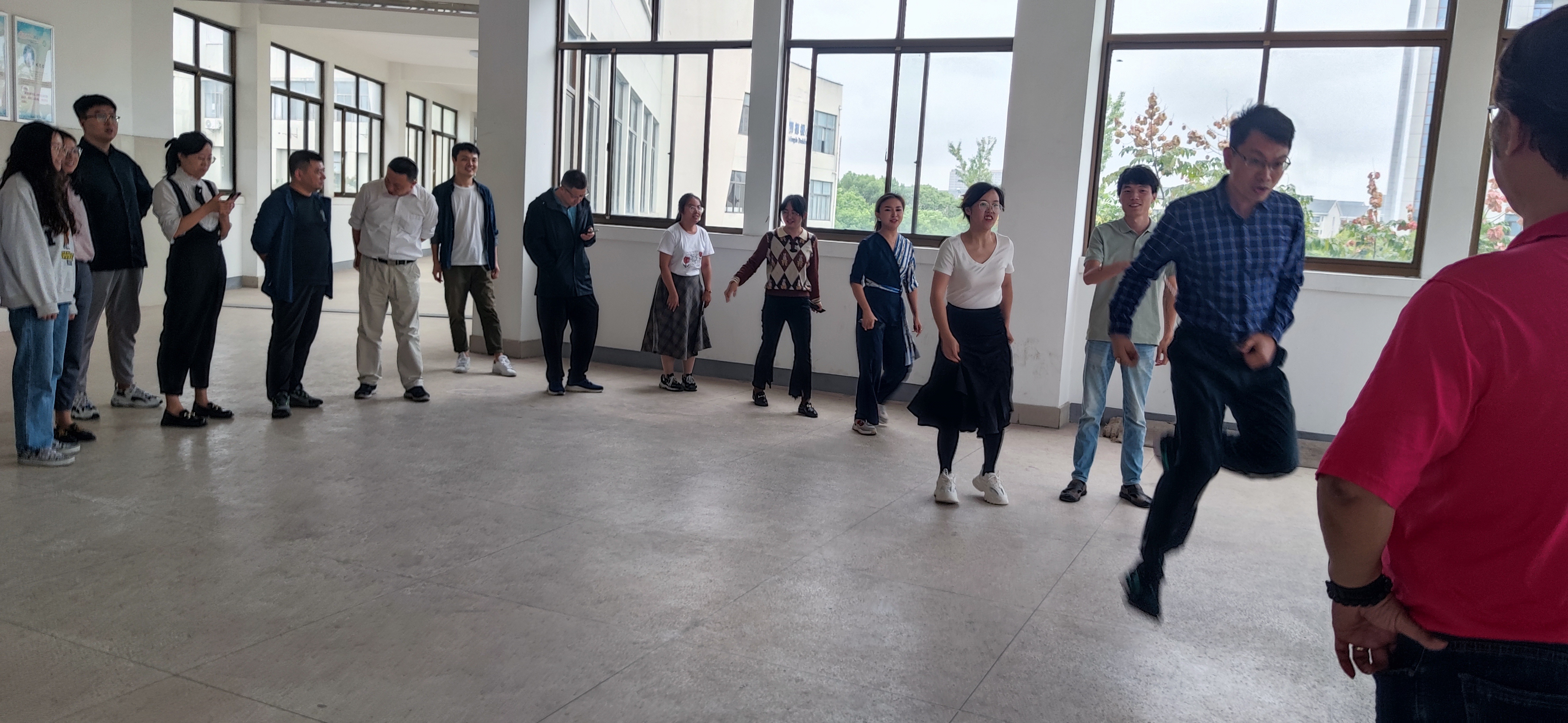 下午两点,全体老师齐聚在明德楼B三楼大厅,大家首先熟悉了跳绳规则,紧接着各系部两两自由组合,组成10人的队伍,兵分三路开始练习。随后,在发令、计数人员的引导下,每一队教师由2人摇绳,其余8人在规定的时间内完成跳绳接龙。随着练习的深入,老师们动作越来越娴熟,身姿越来越轻巧灵活,队友之间的配合越来越默契,活动现场一片欢腾。
