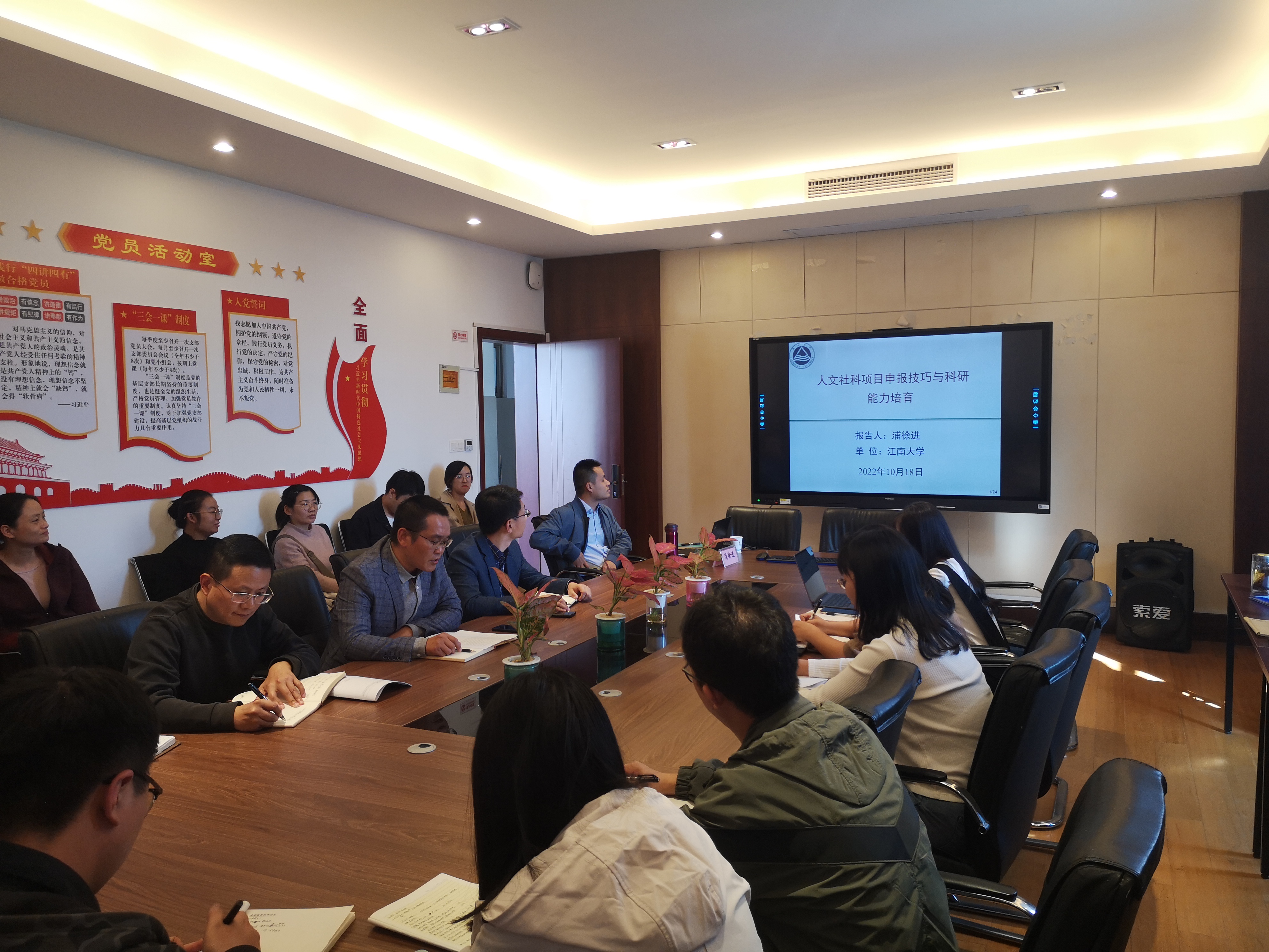 为了进一步把握各级科研项目申报的重点和难点,促进管理学院教师的科研能力提升,助力新进教师的科研成长,扎实有效的推进管理学院的科研工作,10月18日下午1点半管理学院在明德楼A-315会议室,邀请了江南大学商学院浦徐进院长给学院的博士和新进教师做了题为“人文社科项目申报技巧与科研能力培育”的专题讲座。