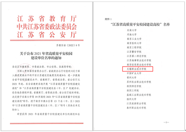 近日,江苏省教育厅、中共江苏省委政法委员会、江苏省公安厅联合印发了《关于公布2021年省高质量平安校园建设单位名单的通知》(苏教安函﹝20228号),我校荣获首批“江苏省高质量平安校园建设高校”荣誉称号。