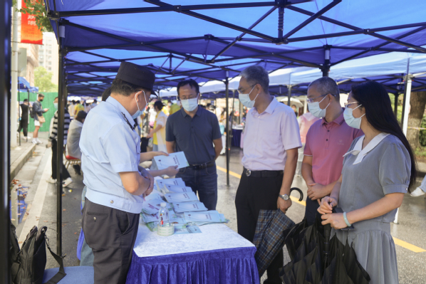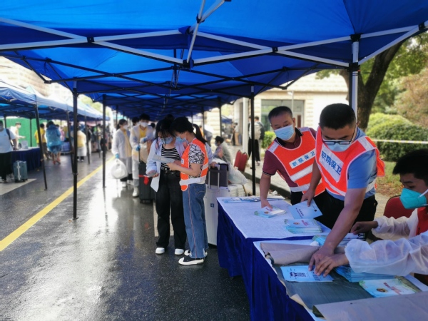 在台风“梅花”的影响下,天空飘起了蒙蒙细雨。但二支部的每位同志都热情高涨,积极参与,北门口的报到通道的预设点,为每一位查验通过的新生发放《2022级新生入学校园安全温馨提示》《防范电信网络诈骗宣传手册》,为萌新们答疑解惑。