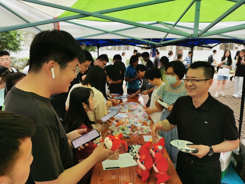是时,在食堂门前的主干道上,支部的党员们热情招呼每一位前来的学生,分发印有本次活动具体安排的小团扇。学生们积极响应,通过学习通扫码参加“知识竞赛”答题,按规则,每位参与的同学都能得到解压神器“捏捏乐”一只,答对7-10题的还可以获得“吉祥兔”一只。