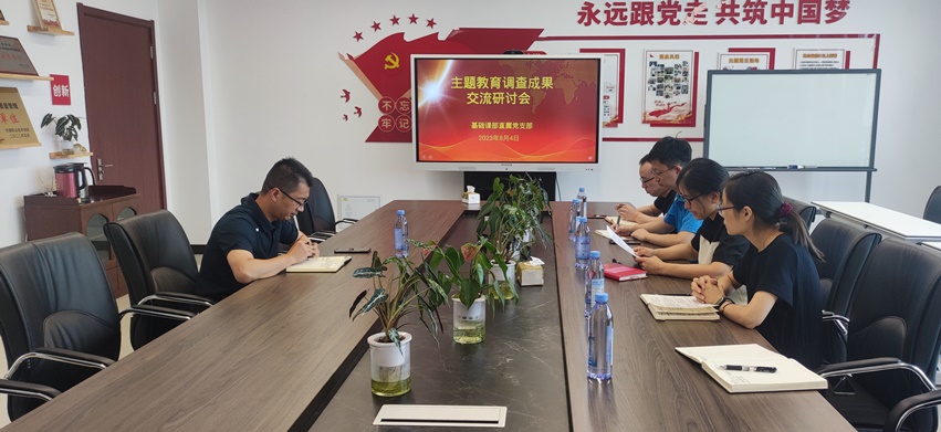 为深入学习贯彻习近平新时代中国特色社会主义思想,扎实推进主题教育,根据学校党委工作部署要求,8月4日上午,基础课部直属党支部在崇德楼804会议室召开学习贯彻习近平新时代中国特色社会主义思想主题教育调研成果交流会,校党委委员、纪委书记李衔到会指导,支部支委委员、部门教研室主任参会,会议由支部副书记王兰主持。