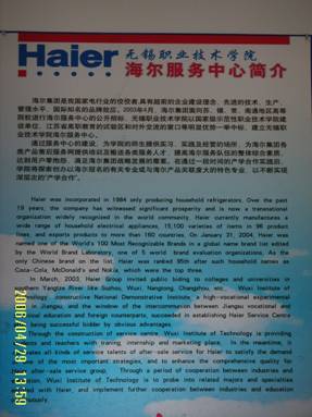 海尔服务中心配有:家用空调、冰箱、热水器等海尔家电设备和工具。由校企联合设计,开设对海尔售后服务人员的培训,以及制冷维修工中级和高级工培训。该实训室能承担的课程主要有:《专业认知实习》、《冰箱与空调维修实训》、《钎焊实习》、《制冷设备拆装实训》、《制冷与空调自动化》等。还可用作学生创新及小制作、教师科研等。