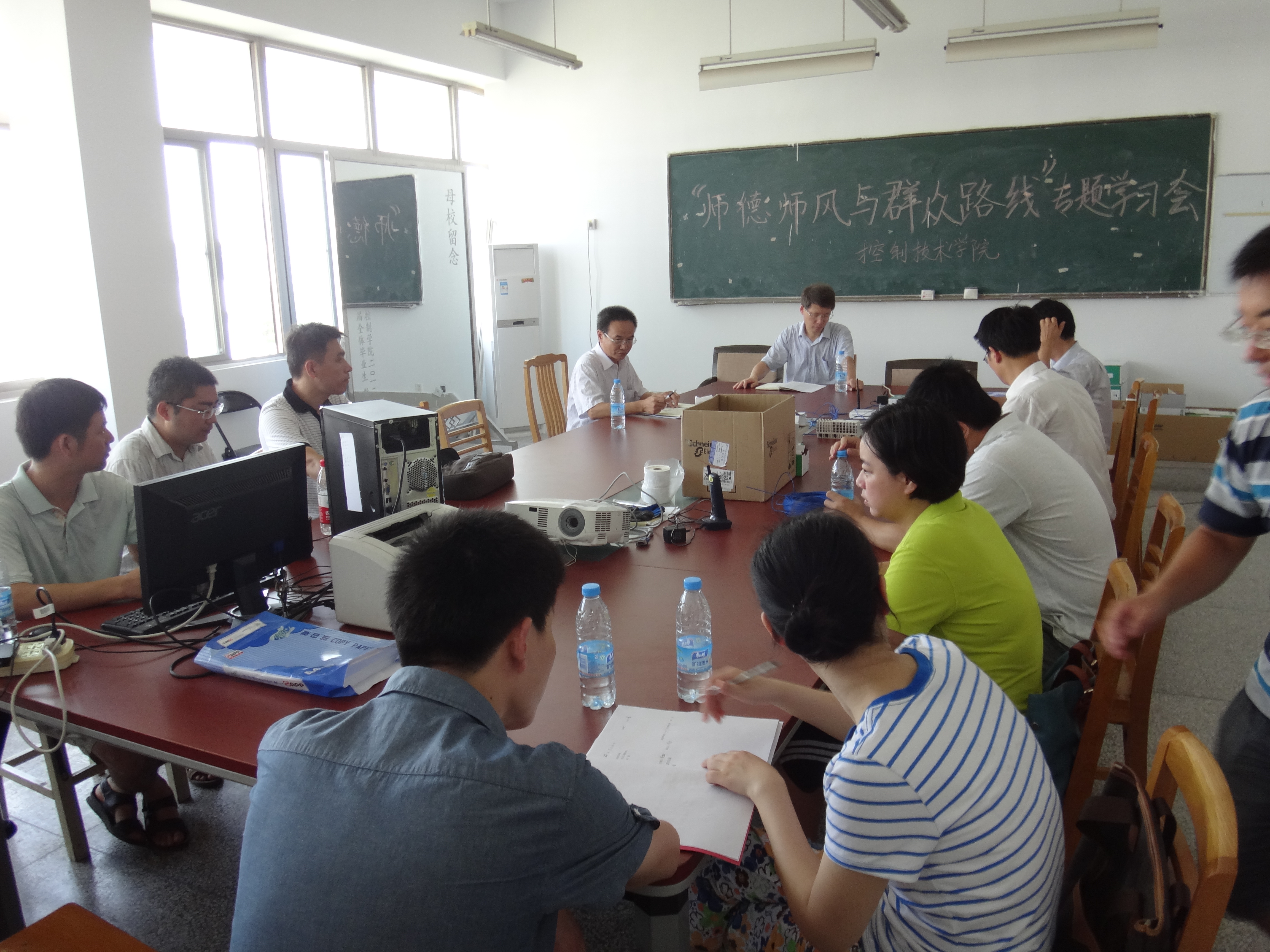 J2-408进行“师德师风与群众路线”专题学习会;其他与会人员在国教205以“为师生服务零距离”为主题的意见征集及群众工作经验交流会。