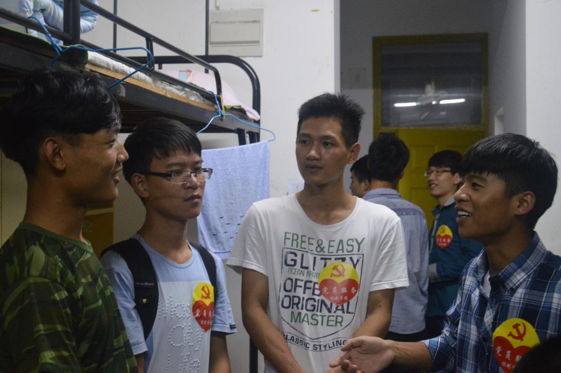 控制技术学院现有学生党员14名。为了让学生党员践行党的群众路线,更好的发挥作用,服务广大学生,学院在迎新的队伍中专设了学生党员服务点。迎新当日,学生党员们全体出动,不仅耐心应对新生和家长的咨询,还主动向他们介绍学校的基本情况,传授新生适应指南。军训期间,控制学院的学生党员们还自发走进新生宿舍,询问学弟学妹们的适应情况。新生关心的话题很多,无论是专业学习、就业出路还是社团选择、时间安排,党员们都结合自身经历,详细解答。整个学院145个新生宿舍,分布在3个园区,全部走访实属不易,但他们没有落下一个。走访的过程中,他们还细心做了记录,将走访的情况反馈给相应班级的班主任老师。
