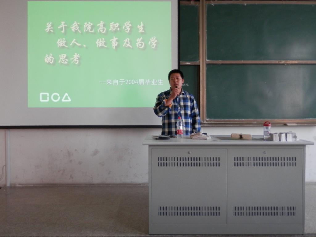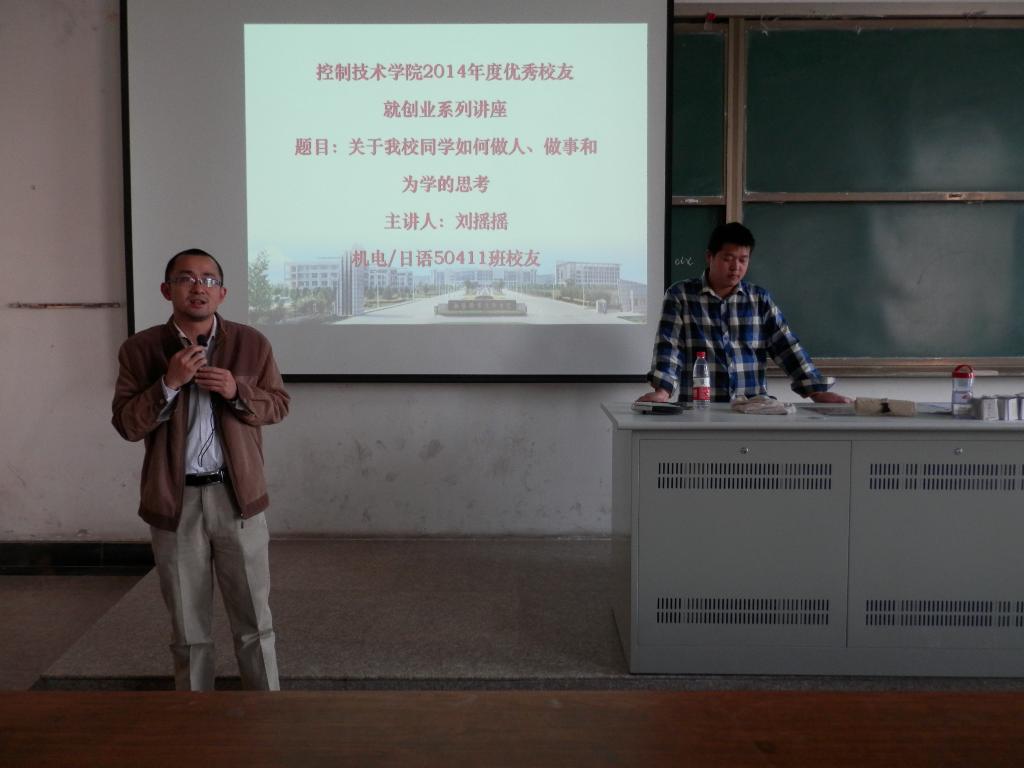 2014 年11月26日 下午15:30,控制学院特邀请2004级优秀校友、现任无锡雪浪环境科技股份有限公司电气工程师的刘摇摇学长回到母校,在J9-302做了主题为《关于我校高职生如何做人、做事和为学的思考》的专题讲座。