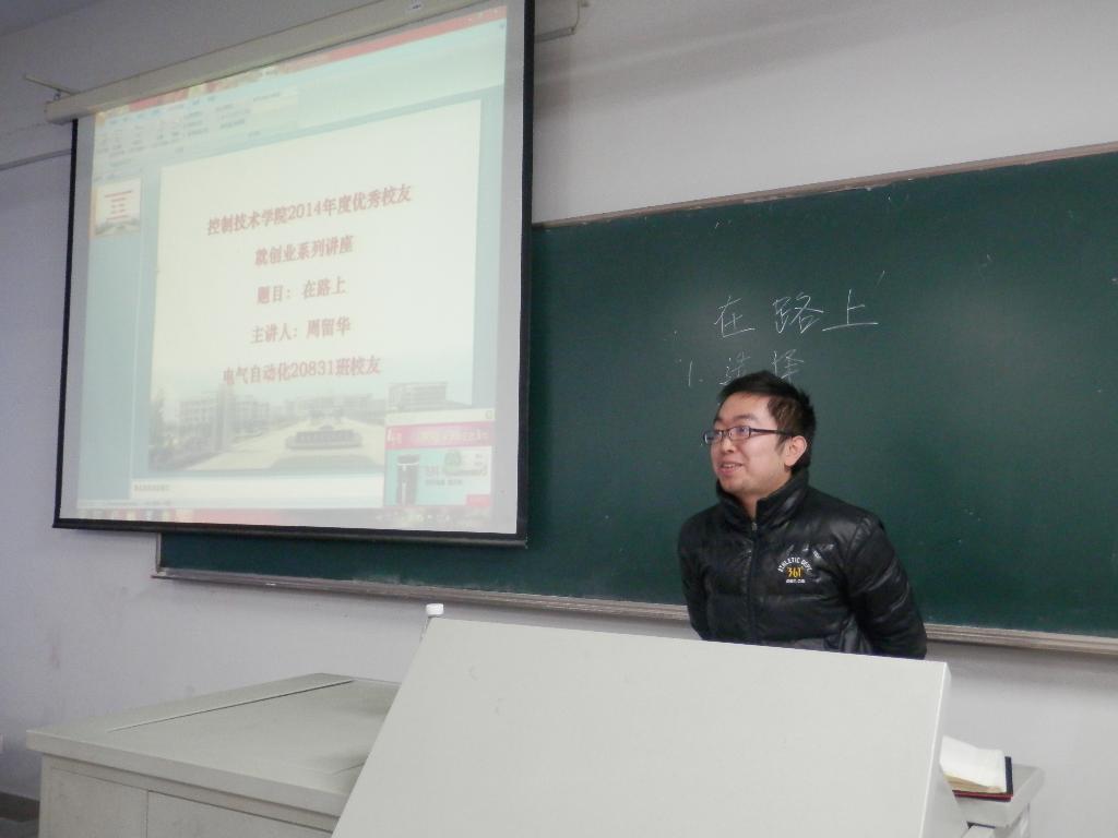 2014年12月15日下午15:30,控制学院特邀请2008级优秀校友、现任苏州达亚电子有限公司产品部经理的周留华学长回到母校,在J3-402做了题为《在路上……》的专题讲座。