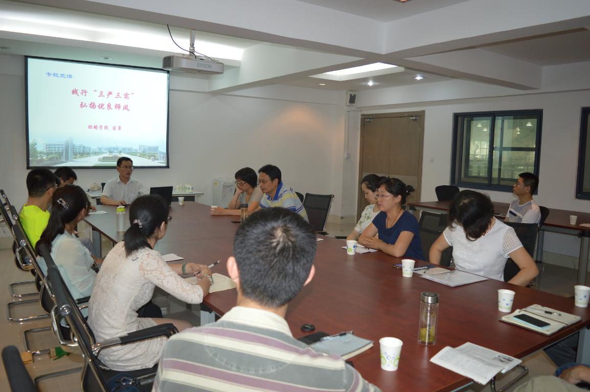为扎实推进“三严三实”专题教育, 6 月 30 日下午 ,控制技术学院党总支在智能制造工程中心会议室召开专题党课学习活动。党总支副书记苗勇同志为分院全体党员作了《践行“三严三实”,弘扬优良师风》的专题党课。