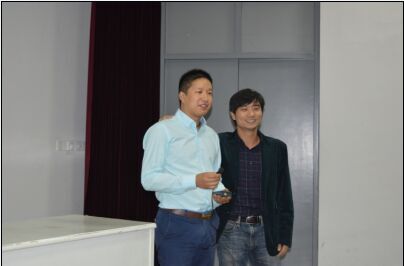 尹国 君学长向同学们讲述了他在校担任学生会主席的工作经历和毕业后的就创业过程,他用平实的语言将他的青春和奋斗过程娓娓道来。他一开始从事销售工作,每天跑10多家企业去去推销产品,受尽了冷眼和谩骂,特别是讲到自己被保安放狗追咬和在工地旁边同建筑工人一起吃2元钱的阳春面的经历,他也激动地落下了眼泪。他拼搏奋进、坚持不懈的精神感动了在场的同学们。他从“谦虚低调”、“脚踏实地”和“保持心态”三个方面对在场的学弟学妹们提出了期望。接下来,他又请上了特邀嘉宾——现任宜兴一家环保公司总经理也是他的同班同学的尤聪聪,来讲述他们那个时代的青春故事。他们积极、阳光、幽默的“二人转”不仅让在场的同学们听得津津有味,也不时引发出一阵阵热烈的掌声。