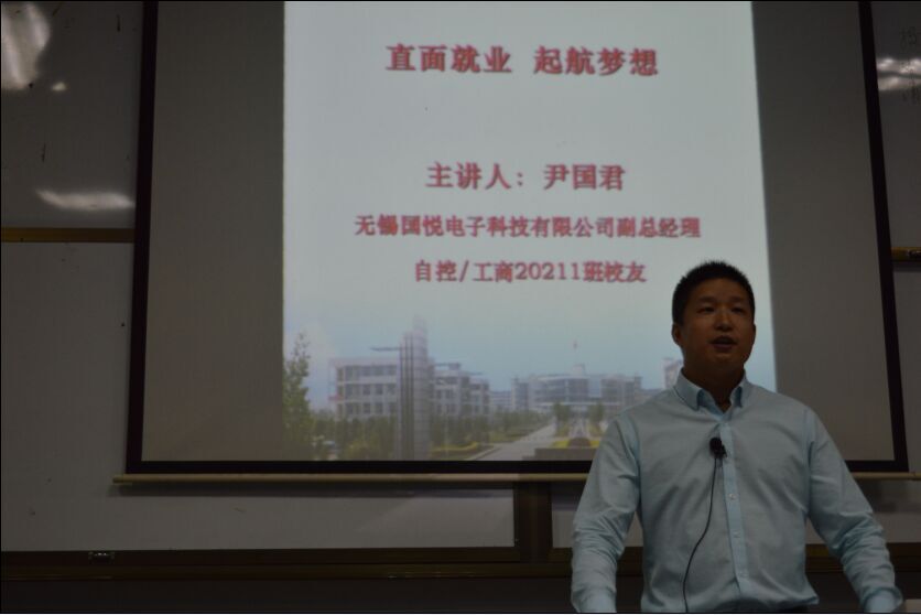 2015 年10月21日 晚上19:00,控制学院邀请2002级优秀校友、现任无锡国悦电子科技有限公司副总经理的尹国君学长回到母校,在J4-102开展了主题为《直面就业,起航梦想》的专题讲座。