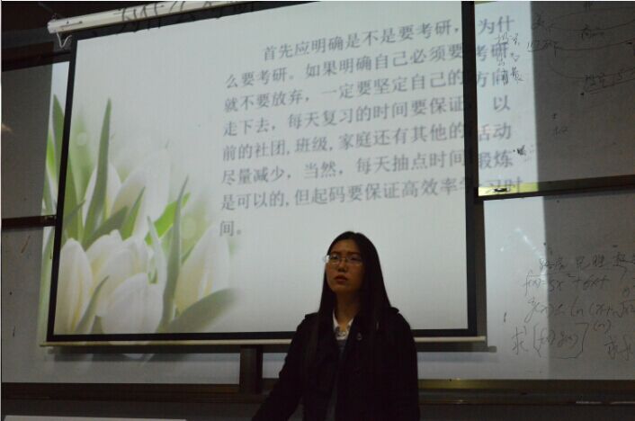 李晖学姐从明确考研目的、如何选择目标学校、如何备战初试、如何备战复试、如何应对调剂以及可能遇到的常见问题等几个方面展开讲座,结合自己考研的经历,逐一向在场的学弟学妹们介绍经验。特别是在介绍备考方法时,从数学、英语、政治、专业课四个方面,分享了很多具有实战意义的宝贵攻略,也介绍了自己参加复试的成功经验,并对考研过程中最容易遇到的问题和困难一一给出了破解办法。最后,李晖学姐勉励大家考研成功的核心秘诀就是专一、专心和专注,一心一意考研,制定好复习计划并坚决执行,保持平静愉悦的心态,就离成功不远了。