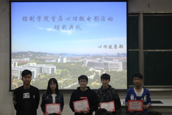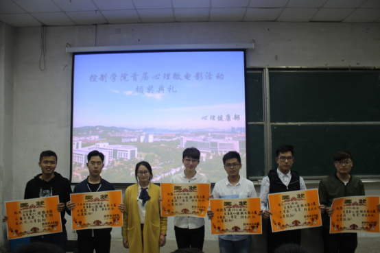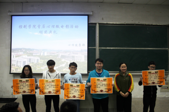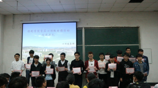 控制学院心理健康部以关注大学生心灵成长,关爱大学生心理健康为初衷举办了控制技术学院首届心理微电影大赛,并于4月27日晚,在至善楼C(原J9)102室举行首届心理微电影活动颁奖典礼。本次活动,特别邀请了辅导员郑月圆老师和赵欣欣老师以及分团委学生会部门的一些委员。活动开始之后,主持人先后播放了三部优秀的心理微电影,并请郑月圆老师、赵欣欣老师、学习部部长丛鹏学长对三部影片进行了点评,大家都惊叹于演员的精湛演技以及幕后的优秀制作,不由的感叹到青春真好,观影结束之后,进行了活动第二项议程,对优秀作品和优秀个人进行表彰,由特邀嘉宾对所有获奖集体和个人进行颁奖,最后由赵欣欣老师对本次活动进行总结。