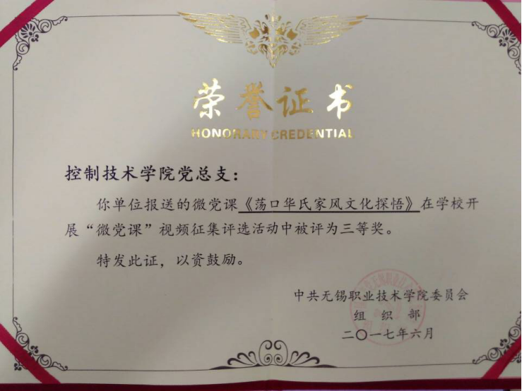 我总支高度重视,积极筹备,组成了由苗勇策划监制、任重威撰稿剪辑、郑月圆编导摄像的制作团队。经过为期近一个月的努力,报送作品《荡口华氏家风文化探悟》最终在学校微党课评比中获得三等奖。