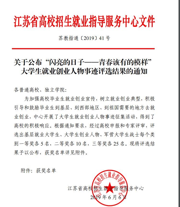 近日,江苏省高校招生就业指导服务中心公布了第二届“闪亮的日子——青春该有的模样”大学生就业创业人物事迹评奖活动名单,我院报送的2015届毕业生电气21232班冯佳立足平凡、甘于奉献的优秀事迹,荣获了基层就业大学生二等奖。