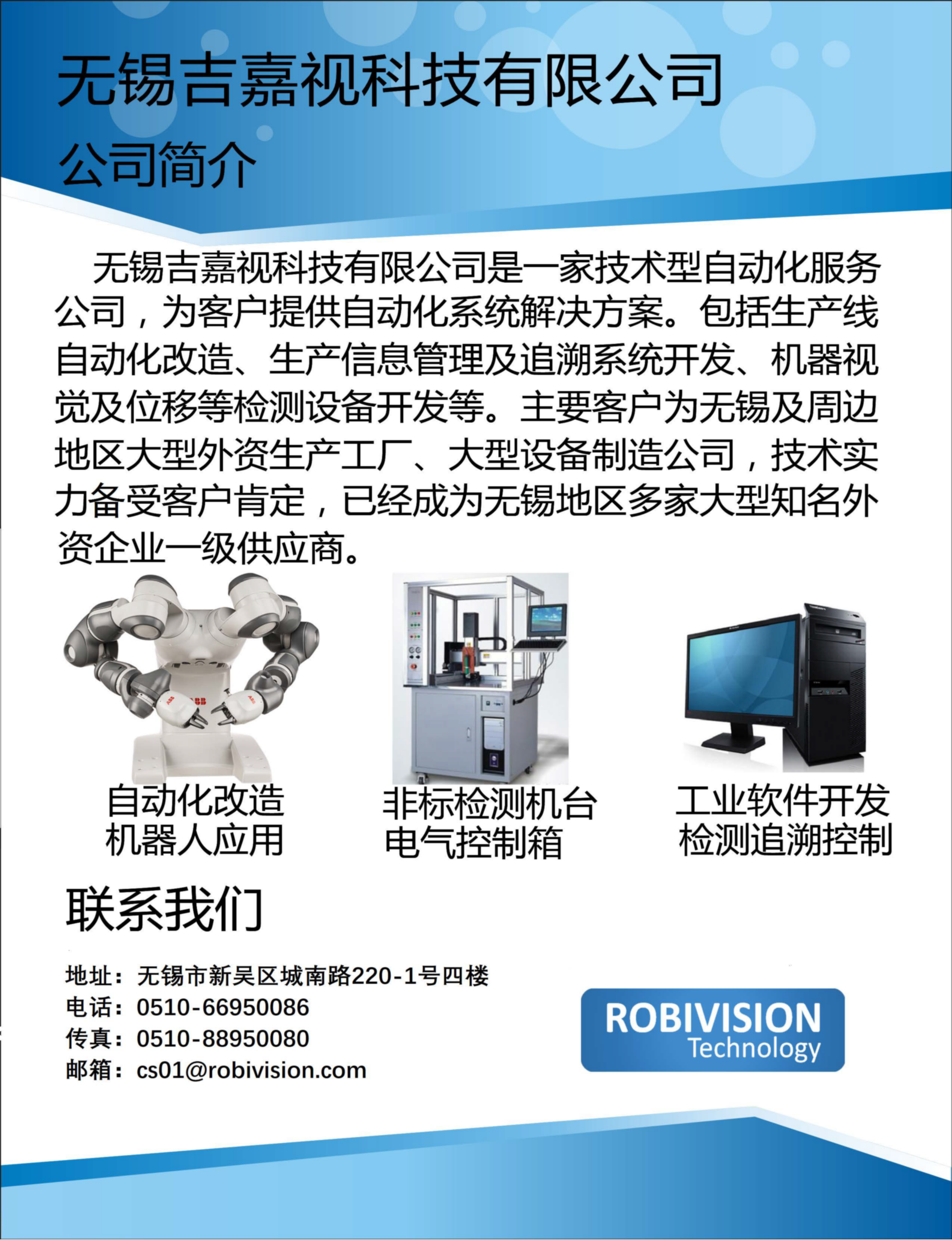 无锡吉嘉视科技有限公司是一家技术型自动化服务公司,为客户提供自动化系统解决方案。包括生产线自动化改造,生产信息管理及追溯系统开发、机器视觉及位移等检测设备开发等,主要客户为无锡及周边地区大型外资生产工厂、大型设备制造公司,技术实力备受客户肯定,已经成为无锡地区多家大型知名外资企业一级供应商。