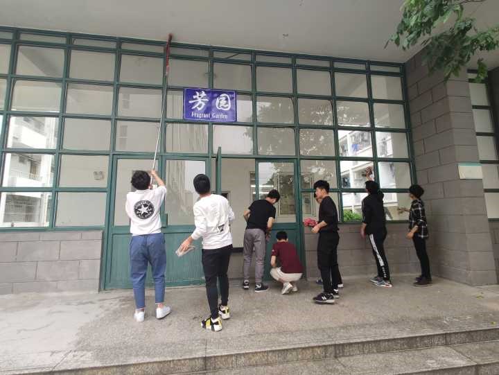 各位同学挥汗如雨,尽管灰尘弥漫,依然尽心尽责,从楼梯到走廊,从墙壁到玻璃,都用心清扫。在他们的汗水浇灌下,芳园宿舍楼公共区域焕然一新。