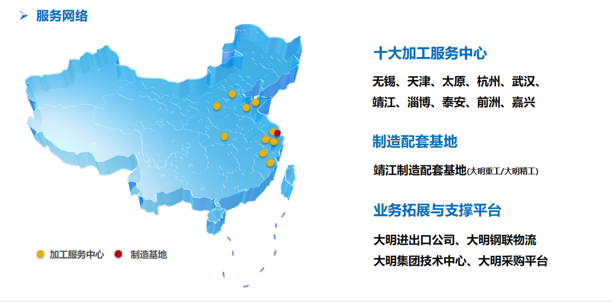 大明集团为强化深加工服务配套能力,2010年11月成立江苏大明精密钣金有限公司,2018年10月更名为江苏大明精工制造有限公司。大明精工可以为用户提供“一揽子”加工配套解决方案,提供从设计、选材、工艺优化到制造配送的“一站式”服务。