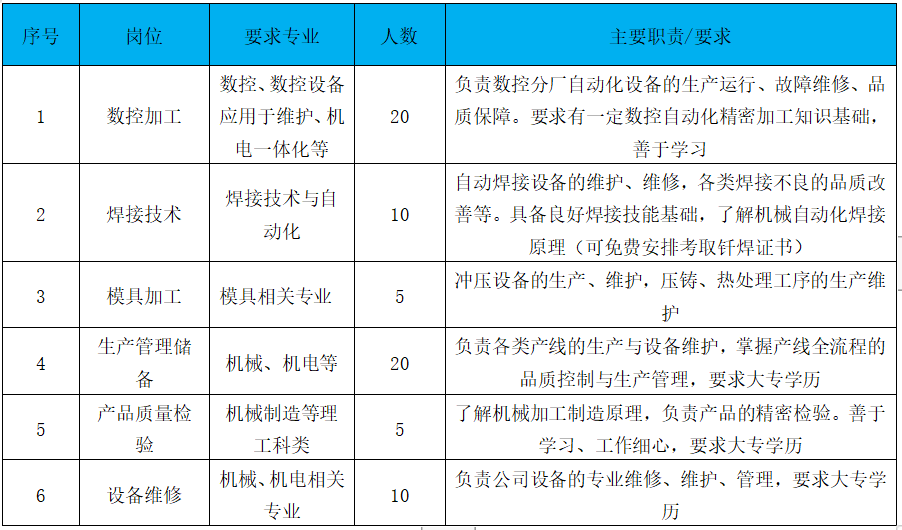 18-25周岁,大专及以上学历,身体健康、适应能力强,综合素质良好,机械机电数控等专业优先录取。