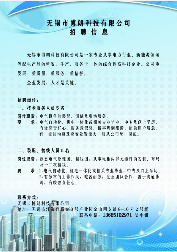 无锡市博朗科技有限公司是一家专业从事电力行业、新能源领域等配电产品的研发、生产、服务于一体的综合性高科技企业。公司重发展、重质量、重服务、重信誉。企业发展,人才是关键。