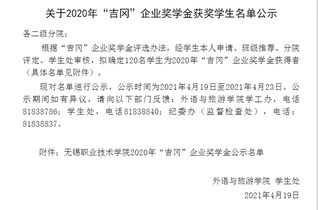 关于2020年“吉岗”企业奖学金获奖学生名单公示