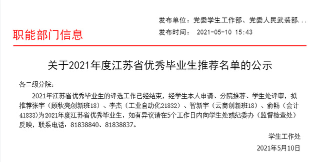 关于2021年度江苏省优秀毕业生推荐名单的公示