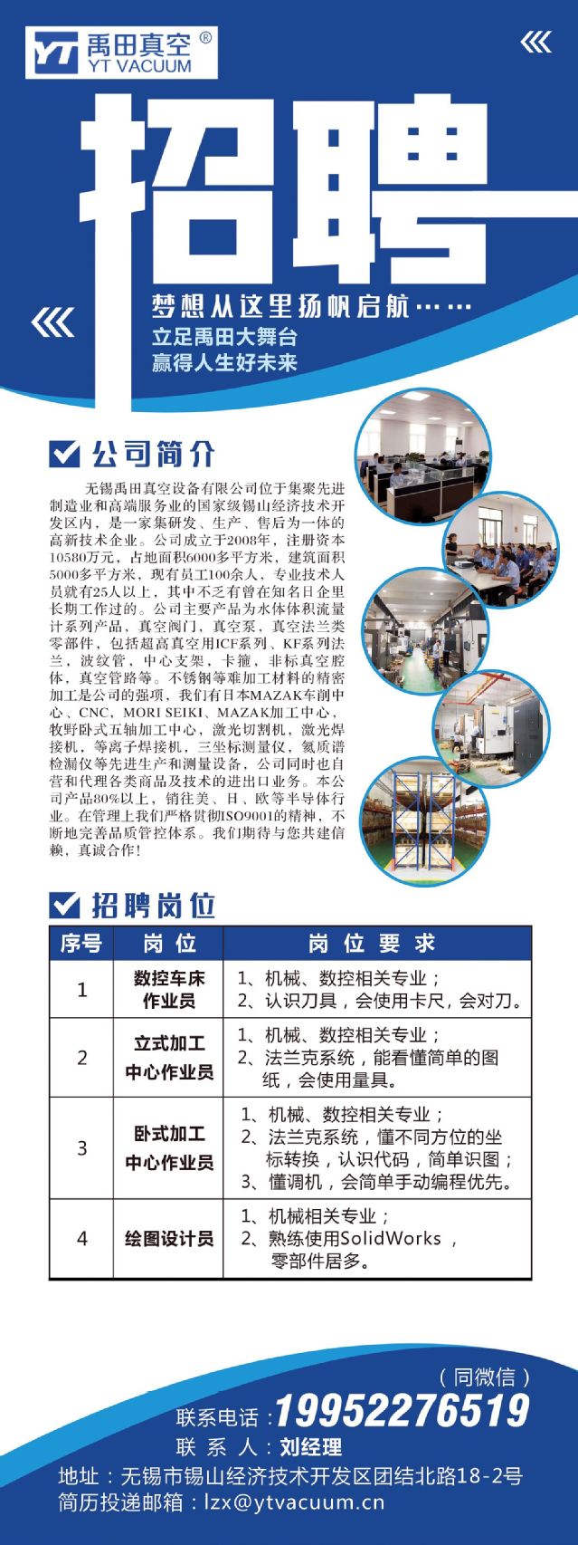 无锡禹田真空设备有限公司位于集聚先进制造业和高端服务业的国家级锡山经济技术开发区内,是一家集研发、生产、售后为一体的高新技术企业。公司成立于2008年,注册资本10580万元,占地面积6000多平方米,建筑面积5000多平方米,现有员工100余人,专业技术人员就有25人以上,其中不乏曾在知名日企里长期工作过的。公司主要产品为水体体积流量计系列产品,真空阀门,真空泵,真空法兰类零部件,包括超高真空用ICF系列、KF系列法兰,波纹管,中心支架,卡箍,非标真空腔体,真空管路等。不锈钢等难加工材料的精密加工是公司的强项,我们有日本MAZAK车削中心、CNC,MORI SEIKI、MAZAK加工中心,牧野卧式五轴加工中心,激光切割机,激光焊接机,等离子焊接机,三坐标测量仪,氦质谱检漏仪等先进生产和测量设备,公司同时也自营和代理各类商品及技术的进出口业务。本公司产品80%以上,销往美、日、欧等半导体行业。在管理上我们严格贯彻ISO9001的精神,不断地完善品质管控体系。我们期待与您共建信赖,真诚合作!