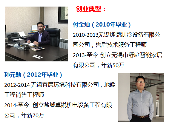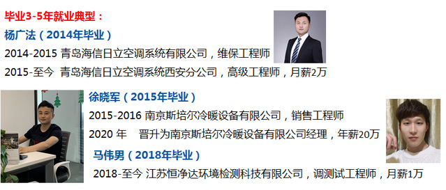 就业单位:江森自控空调冷冻设备(无锡)有限公司、大金空调技术(中国)有限公司、富士通将军中央空调(无锡)有限公司、中国航天科工集团二院二十三所、意大利克莱门特制冷设备有限公司等国内外知名企业。