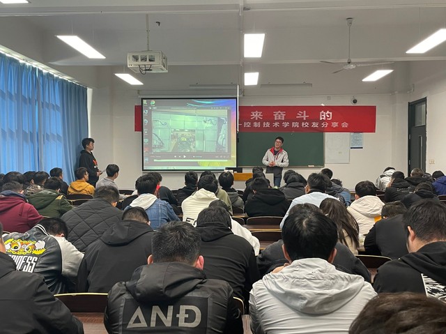 陈虎学长以《青春是用来奋斗的》为本次座谈会的主题,跟同学们讲述了他在校的生活与踏入社会后的工作日常。陈学长给大家展示了他工作时研发的机器人,那一个个庞然大物在屏幕上精准无误的工作,深深吸引着同学们;陈虎学长也给大家拓展了书本外的知识跟经验,分享了自己求职、工作时的经历,大家学习颇多。