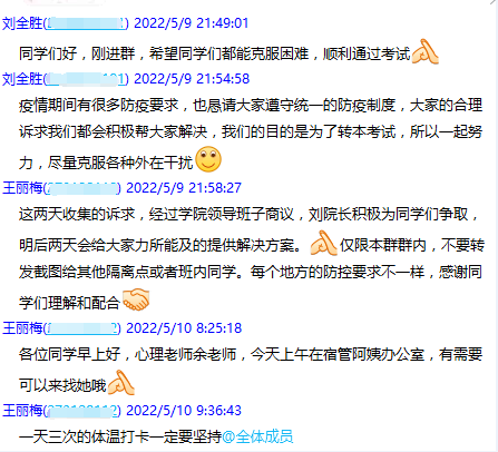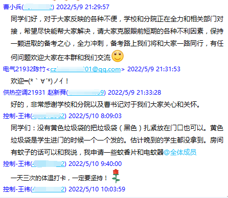 控制技术学院党总支领导班子主动请缨,积极担责,把疫情防控责任牢牢抓在手上、扛在肩上、落在行动上。主动加入不同类型考生QQ群,在群里帮助考生答疑解惑,及时解决考生需求。党总支书记曹小兵加入“3+11返锡酒店入住”群,帮助考生一起克服眼前困难,鼓励大家精心备考,全力冲刺。院长刘全胜加入“48+12中桥校区”群,帮助群内考生解决合理诉求,克服外在干扰。副院长黄从贵、丁健分别加入“7+7酒店入住”群、“市内校外”群,鼓励各位考生在遵守疫情防控要求的同时,积极调整心态,努力备考,争取考取理想院校。分院党总支在得知考生需要一些生活和学习必需品,如学习文具、台灯、灭蚊器、水果等,领导班子及时商议,制定解决方案,由学工办主任王丽梅,工会主席商萍君及时将相关必需品送到考生手上。