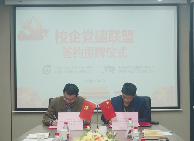为深入学习贯彻党的二十大精神,切实发挥党建引领作用,助推校企合作走深走实,构建“资源共享、阵地连用、活动合办、项目联动、互助共赢”的党建工作新格局,10月26日下午,控制技术学院党总支书记曹小兵、集成电路技术系主任肖国玲、学生代表等一行30余人赴无锡市同步电子科技有限公司(下称“同步科技”)走访调研,与同步科技签署校企党建联盟协议。