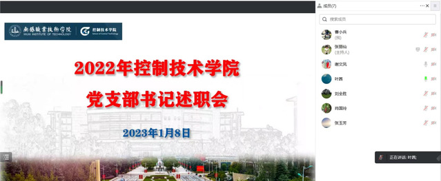为深入学习贯彻习近平新时代中国特色社会主义思想和党的二十大精神,切实提高分院党建工作质量和水平,强化党支部书记抓党建工作的责任意识,控制技术学院党总支于1月8日下午以线上形式召开2022年度党支部书记党建述职评议会,全体党总支委员、党支部书记参加会议。会议由党总支书记曹小兵主持。