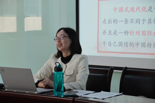 赵葵萍老师从“二十大聚焦中国式现代化”“中国式现代化的中国特色”“现代化模式的中西比较”“中国式现代化的青年担当”四部分展开阐述。她带领大家深入理解什么是“中国式现代化”,中国式现代化理论和全面建设社会主义现代化国家战略布局之间的重要的关系。通过中西方现代化的对比,利用一个个鲜活的历史事件,让同学们深切体会到中国式现代化是物质文明、政治文明、精神文明、社会文明、生态文明协调推进的现代化,是推动构建人类命运共同体、为世界谋大同的现代化,是属于中国自身国情的现代化。最后,赵葵萍老师以“未来属于青年,希望寄予青年,中国式现代化终将在一代代青年的接力奋斗中变为现实”作为讲座的结束语,并寄语同学们要有坚定的理想信念、严明的组织纪律、高尚的品德、积极的奉献精神,用实际行动带动周边的同学,以奋斗姿态激扬青春,不负时代,不负青春。