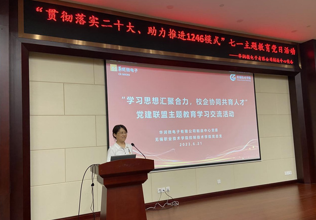 控制技术学院集成电路技术系系主任肖国玲以“学习思想汇聚合力,校企协同共育人才”为主题与企业方进行了深入交流,希望以党建联盟为平台,围绕人才培养方案、课程开发、师资团队建设、项目合作等方面加强双方合作,共同助推无锡市集成电路产业的发展。