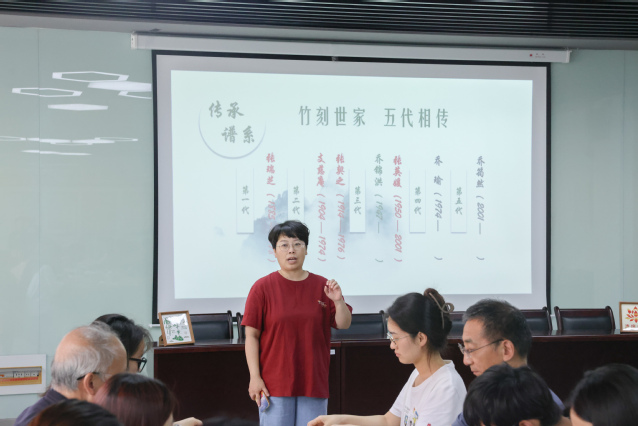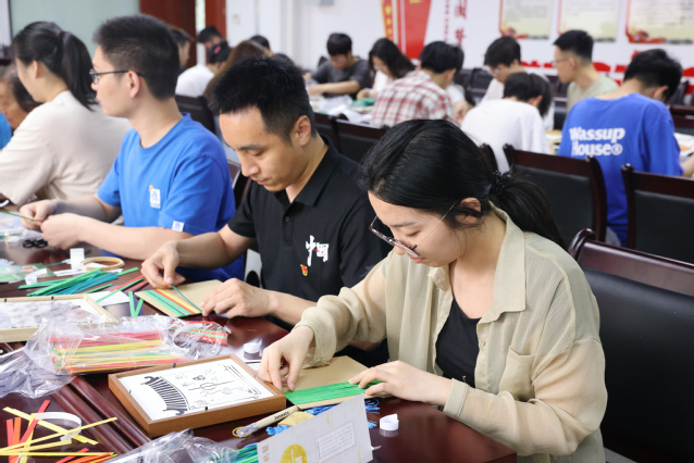 随后,国家级非物质文化遗产项目(无锡留青竹刻)省级代表性传承人乔瑜老师为全体师生详细讲解了“留青竹刻”的历史,并教大家动手制作竹刻作品。从最基本的刻刀握法教起,为大家一一阐述圈边、铲底等环节的做法。留青竹刻需经选材、构图、切边、铲底、清底、上油、晾晒七道工序,才会有一副成品呈现,留青竹刻刻的是耐心、刻的是定心,刻的是坚韧不拔的精神。体验完留青竹刻,师生们又一起体验了非遗竹编画的制作。“压二挑二,挑二压二”,侨胞代表中的一位老阿姨亲切地教大家怎么编竹编画,竹篾在师生手中一抬一压,相互缠绕,手指一抬一压之间,彰显传统工艺的魅力,精湛的竹艺,匠心思维的传承,更是传统竹编艺术的魅力绽放。师生耐心制作,一件件精美的作品在欢笑中诞生。