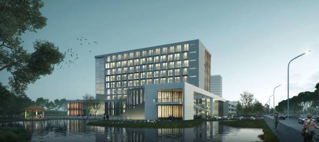 总建筑面积19200平方米,建筑高度32.8米,地上八层,地下一层。建筑形体上总体形成塔楼加裙房的处理方式。其中裙房容纳了所有的实验实训场所、智能制造成果展示大厅、阶梯教室和计算机培训专业机房,并通过大坡道与基地相融合,形成大基座的感觉。而标准实验室、教授和博士工作室和中小会议室共同组成的塔楼,就坐落于该基座上。塔楼与基座共同形成一个整体。地面设置临时车位24个,地下室设置39个。