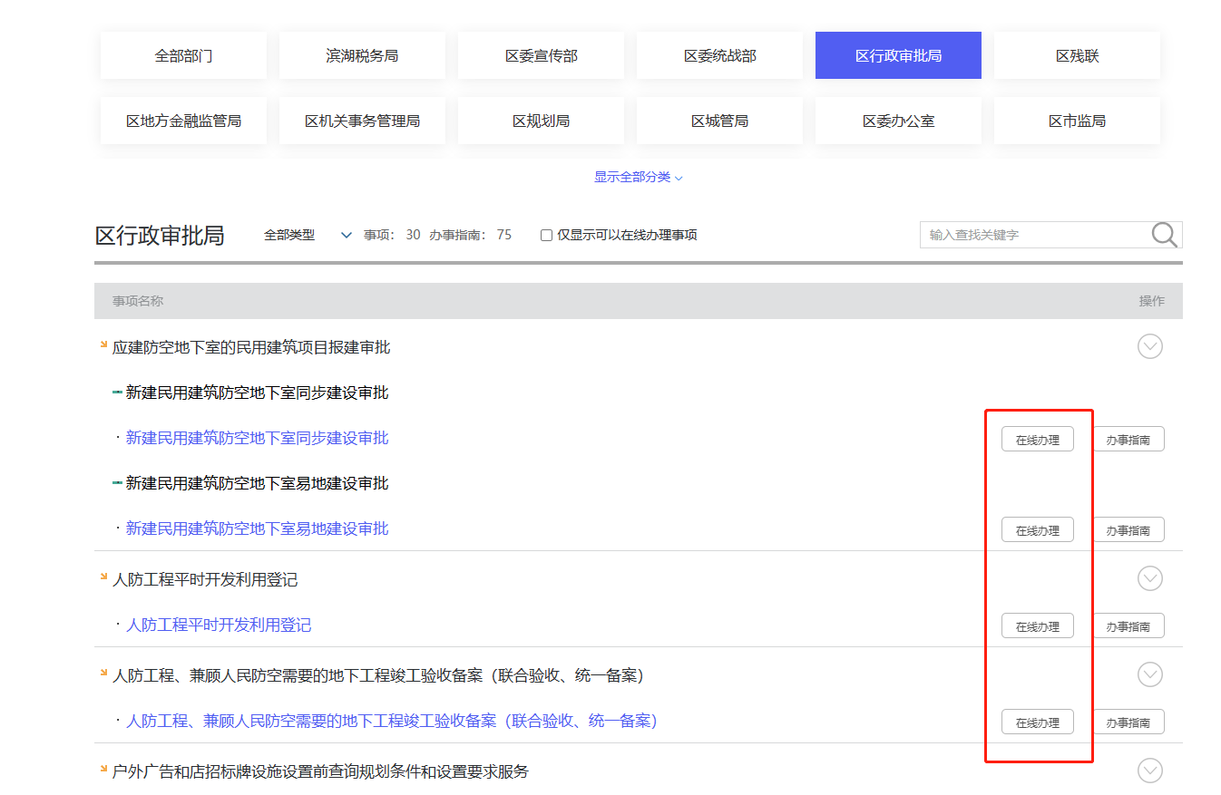 3、根据项目实际情况,选择“新建民用建筑防空地下室同步建设审批”或“新建民用建筑防空地下室易地建设审批”事项,点击在线办理