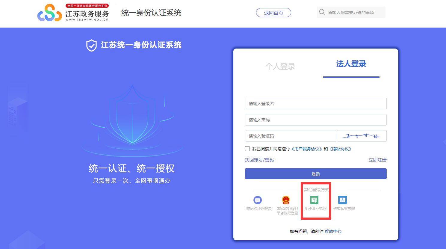 1、登录江苏省政务服务管理平台https://www.jszwfw.gov.cn/,登录法人账号: