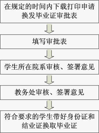 凡因学业原因被作结业处理的学生,离校后且在弹性学习年限内申请返校重新学习并填写《结业生返校重新学习申请表》,经原专业所属学院审核签字,缴纳返校重新学习学分学费,教务处审核,课程所属教学部门教学秘书根据结业生申请安排负责结业生返校重新学习的老师。 结业生符合结业证书换发毕业证书条件(重新学习课程成绩及格、处分解除等),且不超过规定的弹性学习年限(三年制专科不超过六年),可以向原专业所在学院提出换发毕业证书申请,填写《结业生申请换发毕业证审批表》,提交所在学院审核。逾期者不得换发毕业证书。 结业生申请换发毕业证书材料经教务处审核、报批,于次月月底前完成毕业证书换发相关工作,换发的毕业证书上的毕业时间和换证日期一致。 结业生换取毕业证书必须由本人携带身份证和结业证书到教务处办理。