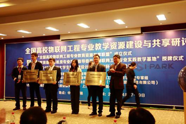 4月18日,教育部高等学校计算机类专业教学指导委员会在东南大学无锡分校举办“全国高校物联网工程专业教学资源建设与共享联盟”成立大会暨研讨会、物联网工程专业实践教学线路发布与首批实践教学基地授牌仪式。教育部科技发展中心主任李志明,教育部计算机类专业教学指导委员会领导,物联网工程专业教学研究专家组专家及物联网产业界人士,全国100余所高校代表参加了交流和研讨。物联网技术学院执行院长刘全胜教授代表我校上台领取全国高等学校物联网实践教学基地铜牌并签署了战略合作协议。