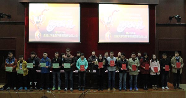 1月5日下午,我校2015年全国大学生数学建模竞赛颁奖典礼暨2016年动员大会在国际交流中心一楼报告厅举行,顾京副校长,教务处、高职本科部、学生处、基础部、校团等相关部门负责人及获奖师生代表等300余人到场。 会上,数学建模协会同学们制作的“无锡职院数学建模宣传片”带领大家“走进”了数学建模,了解了我校的参赛历程。教务处奚小网处长宣布了我校参加2015年全国大学生数学建模竞赛获奖情况,其中专科组国家一等奖1项,国家二等奖2项,江苏省一等奖1项;并作为本科组唯一一所高职院校获得省二等奖1项。与会领导为获奖的15位同学颁发证书并合影留念。 我校数学建模协会会长冯晶玉同学、高职本科班方佳英同学分别分享了他们的参赛心得与体会;数模教练团队代表屈寅春老师介绍了我校数学建模概况,总结了我校数学建模工作所取得的成绩,并对关心我校数学建模工作的各部门领导和老师表示感谢。 顾京副校长在总结讲话中从数学建模对同学们数学实践能力和创新能力培养出发,强调了数学建模的重要性和实用性,肯定了基础部和数学建模教练团队的成绩,表示学校将继续关注和支持数学建模竞赛,勉励同学们要树立目标,要有不断挑战自我的精神。 (基础部 撰稿:屈寅春;摄影:方啸天、李世乐;审核:朱翔)