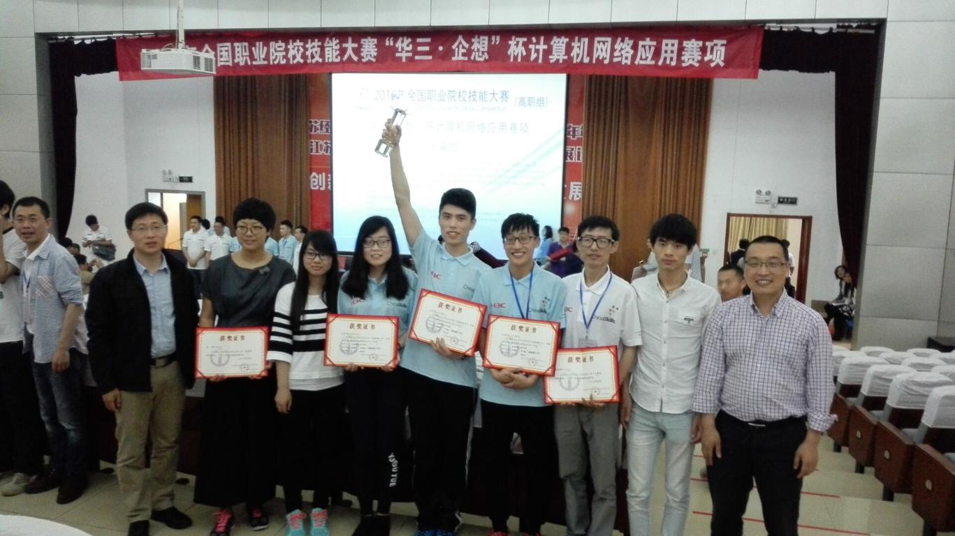 5月26日,全国职业院校技能大赛计算机网络应用赛项在南京江苏经贸职业技术学院举行,来自全国58所高职院校的代表队参加了本项比赛。我校由计算机网络技术专业学生娄瀚文、姬智慧、田飞翔、刘晶(预备队员)、张世权(预备队员)组成的代表队,在王欣、高琪琪老师指导下,努力拼搏,荣获一等奖第一名。