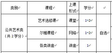 2015、2014级在校三年需修满8学分的素质教育课程,由5种大类课程构成:艺术类(2学分)、文化类(2学分)、心理健康教育类(2学分)、军事理论类(1.5学分)、体质健康测试(0.5学分)。 具体学习时间安排如下: 第一个学期: (1)大学生心理健康课(网络)2学分 (2)军事理论课(课堂、网络)1.5学分 (这2门网络课因任何原因未修满,可在下学年与新生一起重修,具体办法咨询学生处老师) (3)公共艺术课选一门(1-2学分) (学生要在规定的时间在教务网上选课,通过课堂教学、尔雅课程网络在线学习)。 第二个学期: (1)公共艺术课选修一门。 (公共艺术课是2学分,未修满可以继续选修。) (2)讲座。(参加4次讲座为1学分,最高1学分。讲座也算公共艺术课2学分之中的,课任选。可在毕业前5学期内完成。