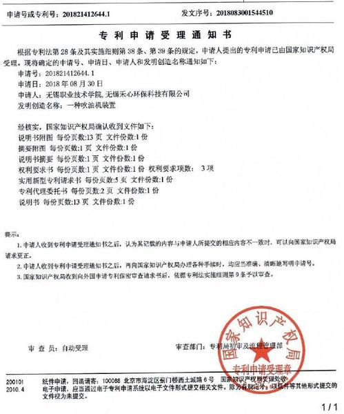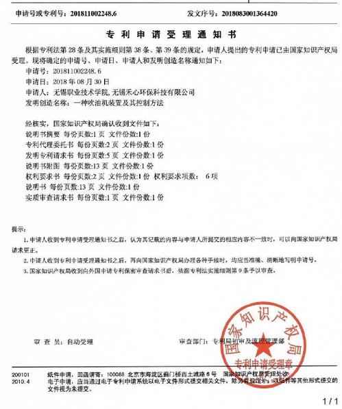 图9吹油机装置实用新型专利受理书 三、吹油机研制过程及展示视频