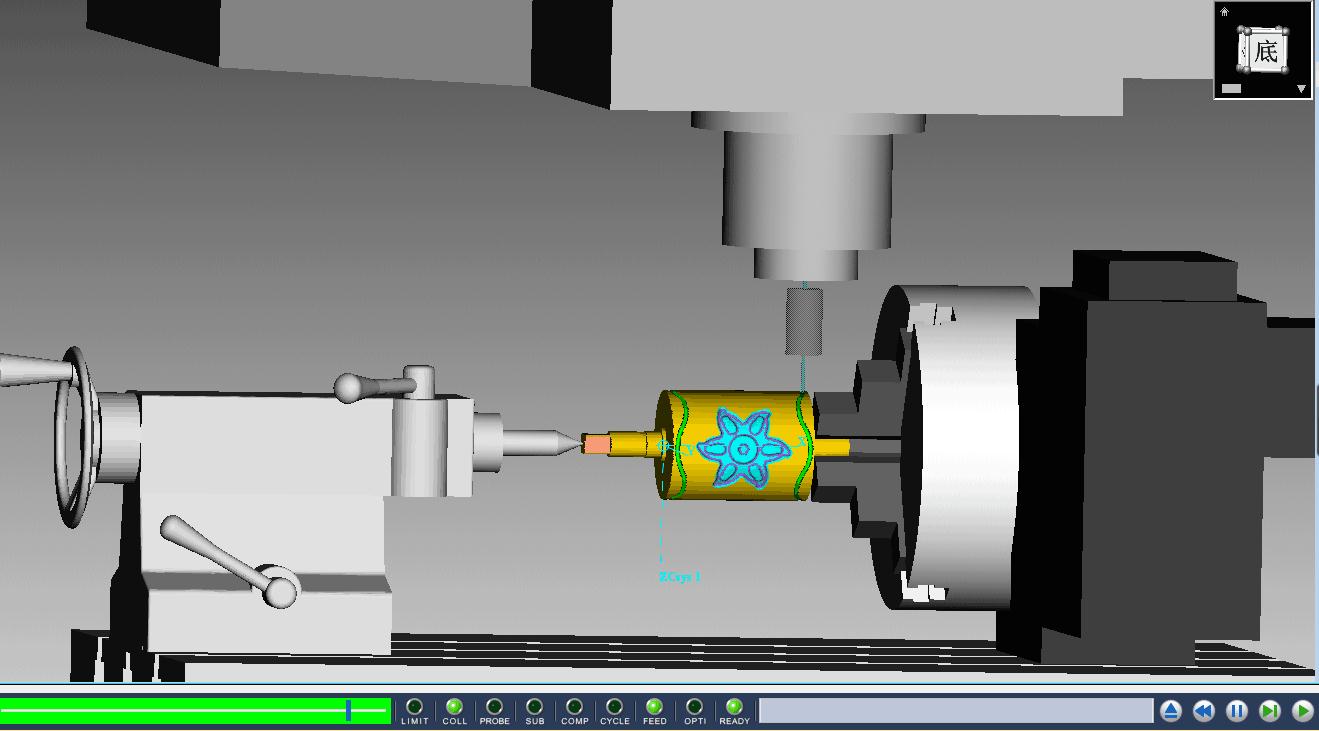 图5构建的多轴加工虚拟机床与多轴零件的虚拟加工过程 (1)钢制压印机凹凸辊的模拟加工仿真视频: (2)钢制压印机模拟运动仿真视频: