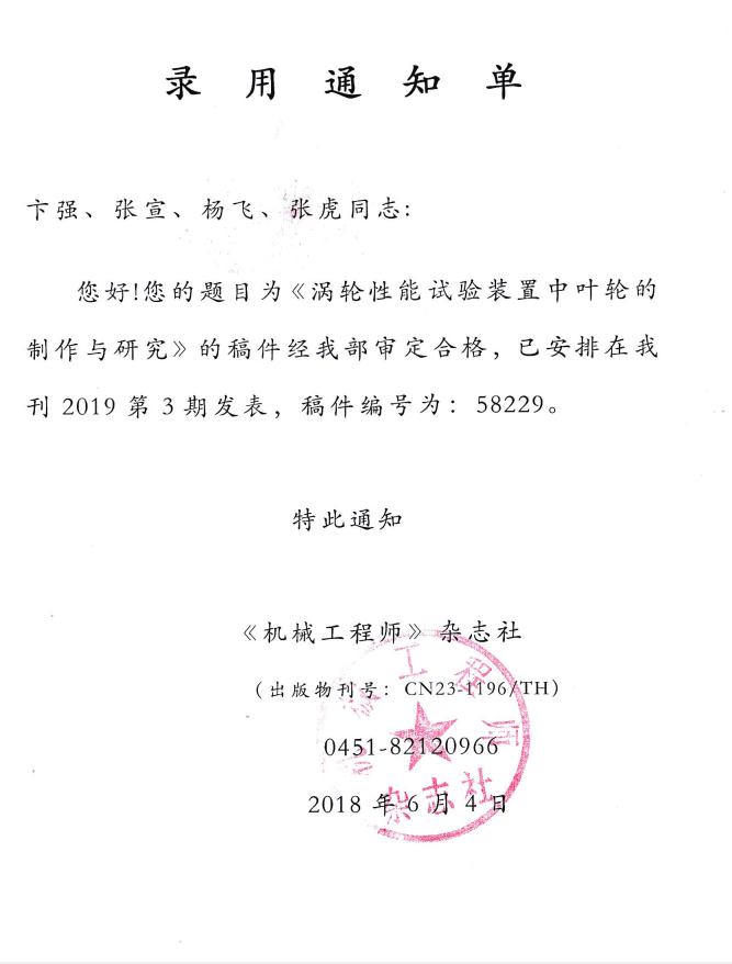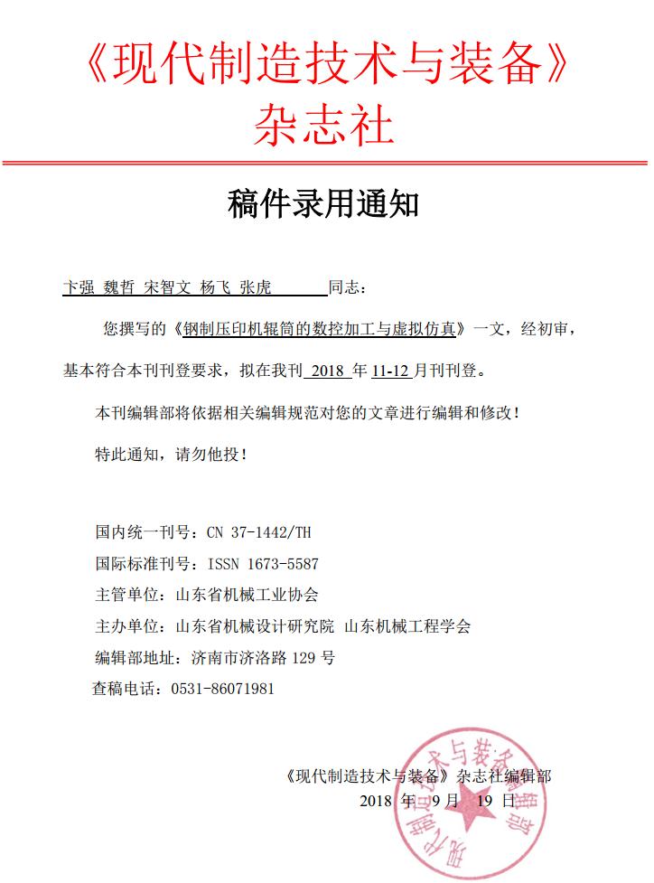 图3.毕业设计期间投稿录用的相关论文录用通知 此外,在钢制压印机的毕业设计制作过程中完成了钢制压印机的数字化模型一套、CAXA-CAPP数字化工艺文件一份、零部件的编程文件与NC程序、机床仿真模型及加工仿真文件、钢制压印机实物、压印产品及仿真运动视频、加工模拟视频、实际加工视频等过程成果文件。 三、钢制压印机的实际加工与模拟加工仿真视频演示 1、钢制压印机成品展示如下: